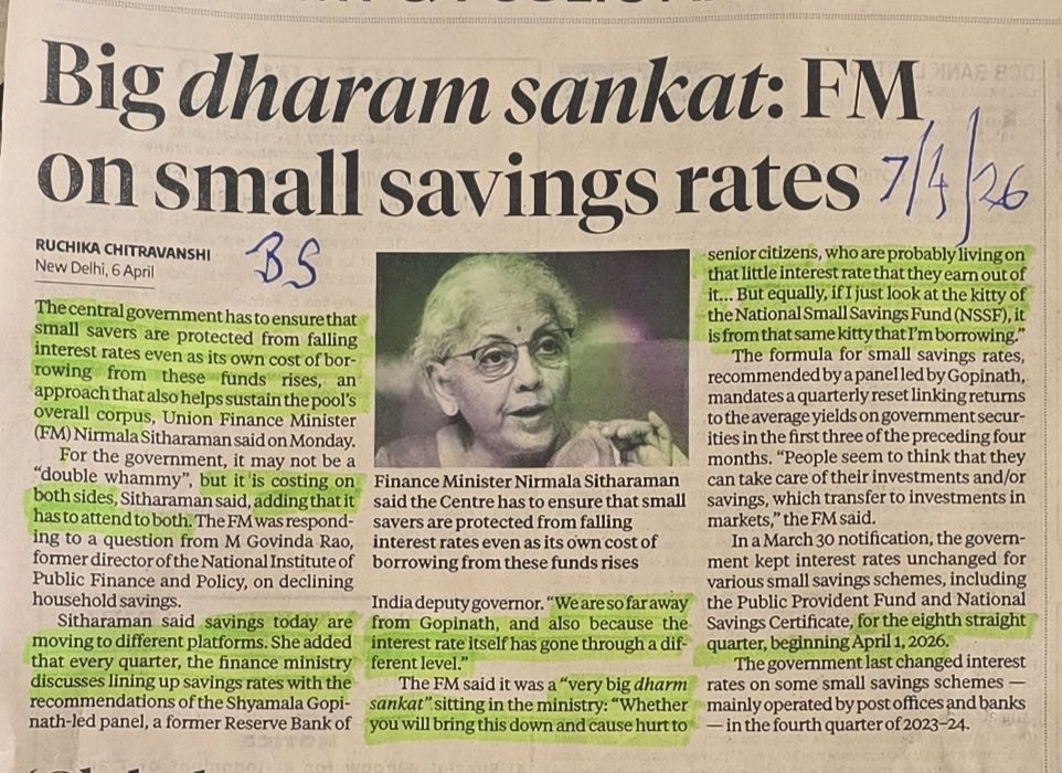 Decision on Interest rates on small savings –Why the FM takes it as a ” Dharma Sankat [ धर्मसंकट ]” Courtesy BS
