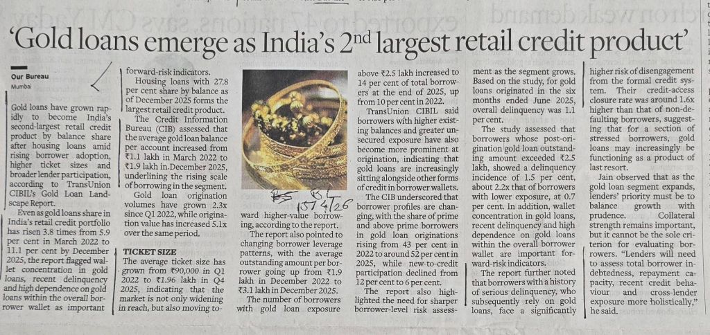 CIBIL’s Gold Loan Landscape Report — average ticket size grown from 90000 in Q1 2022 to 1.96 lakh in Q4 2025– [2] CIBIL points to a need to sharper borrower level risk assessment as the segment grows — Courtesy BusinessLine