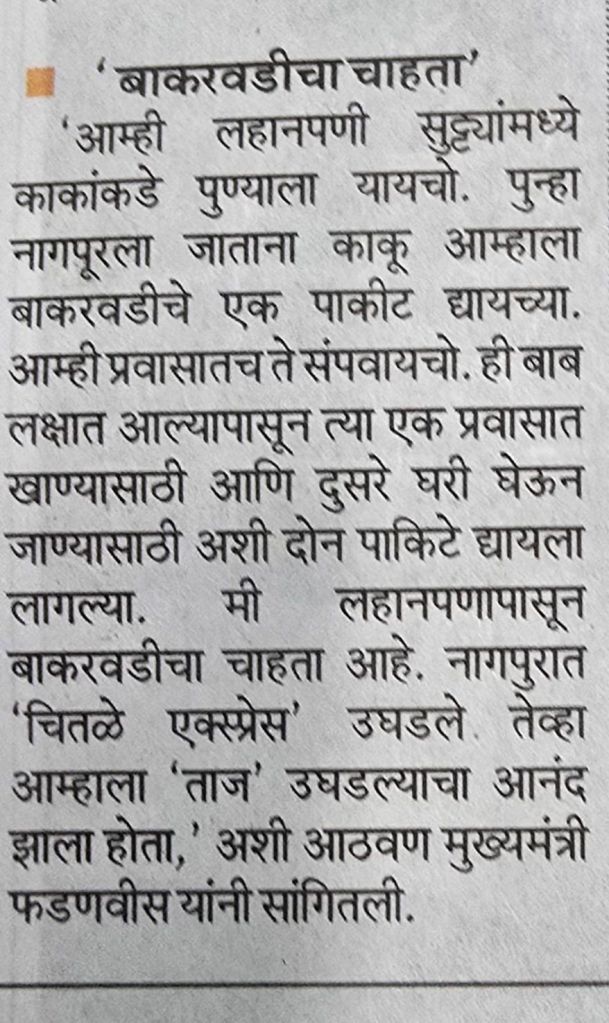 मुख्यमंत्री श्री फडणवीस यांनी बाकरवडी बाबत सांगितलेला किस्सा– बातमी सौजन्य महाराष्ट्र टाइम्स
