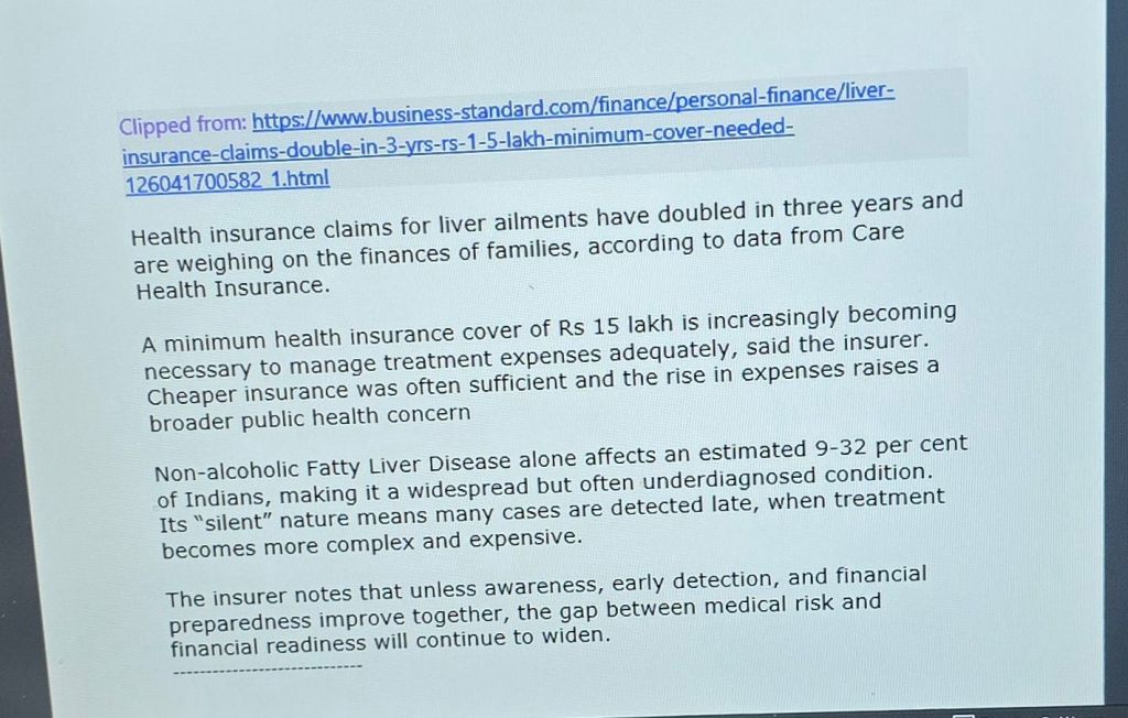 *Liver ailments–[1] Health insurance claims have doubled in three years and are weighing high on the finances of families [2] The insurer — Care Health Insurance– recommends cover of 15 lacs — Courtesy BS