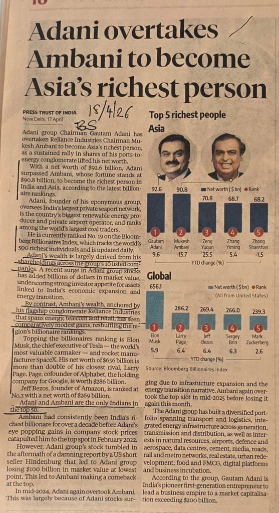 [1] Mr Adani becomes Asia’s richest person [2] Mr Adani and Mr Ambani are the only Indians in the top 50 [2] Mr Musk is number one and has $ 656 billion [3] Next best is Mr Page [ $ 286 billion ]– who is co-founder of Alphabet- the holding company for Google –Courtesy BS