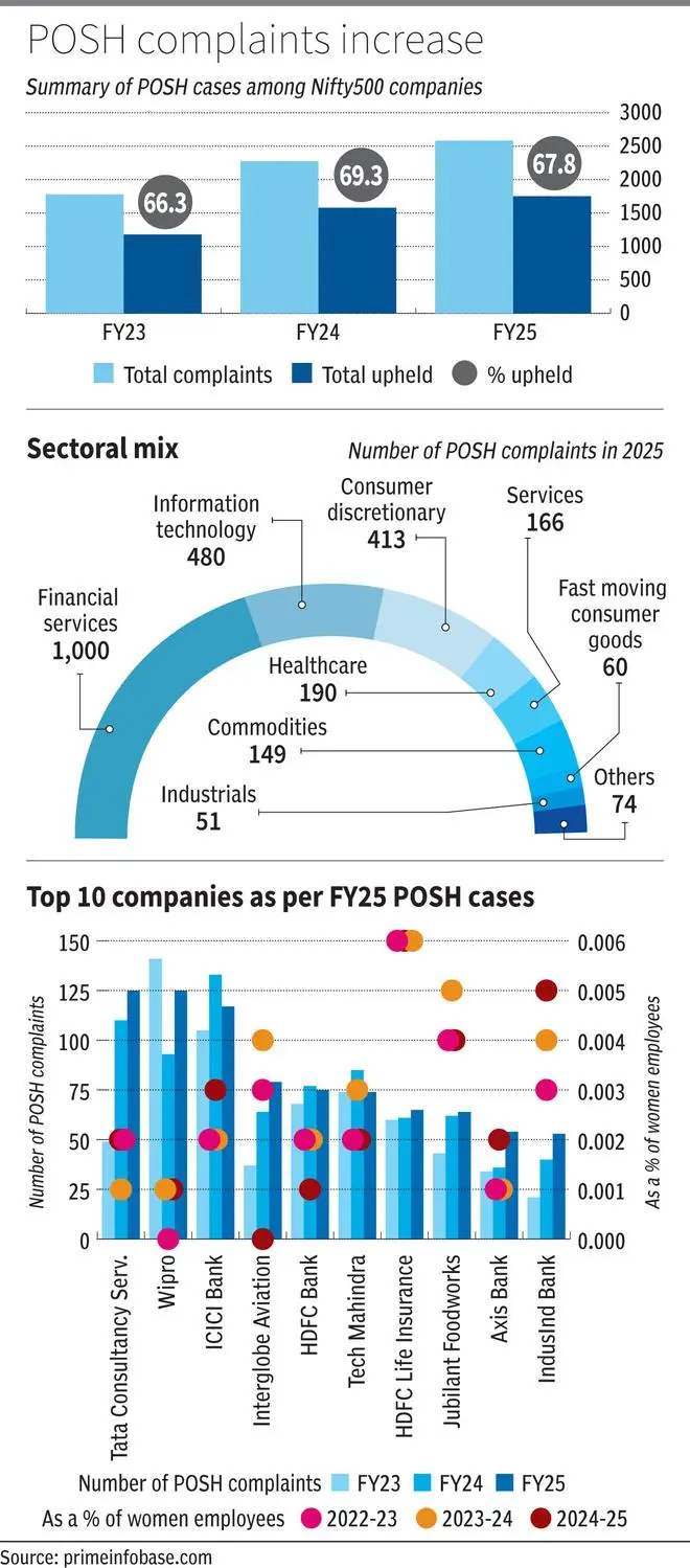 businessline analysis of data sourced from primeinfobase.com shows that POSH cases in Nifty500 companies were up 13 per cent year-on-year in FY25 at 2,583 complaints compared to 2,276 complaints in FY24. This was at 1,779 complaints in FY23. Further, across the three fiscal years (FY23, FY24 and FY25) the percentage of complaints upheld out of the total complaints has been in the range of 66-69 per cent.