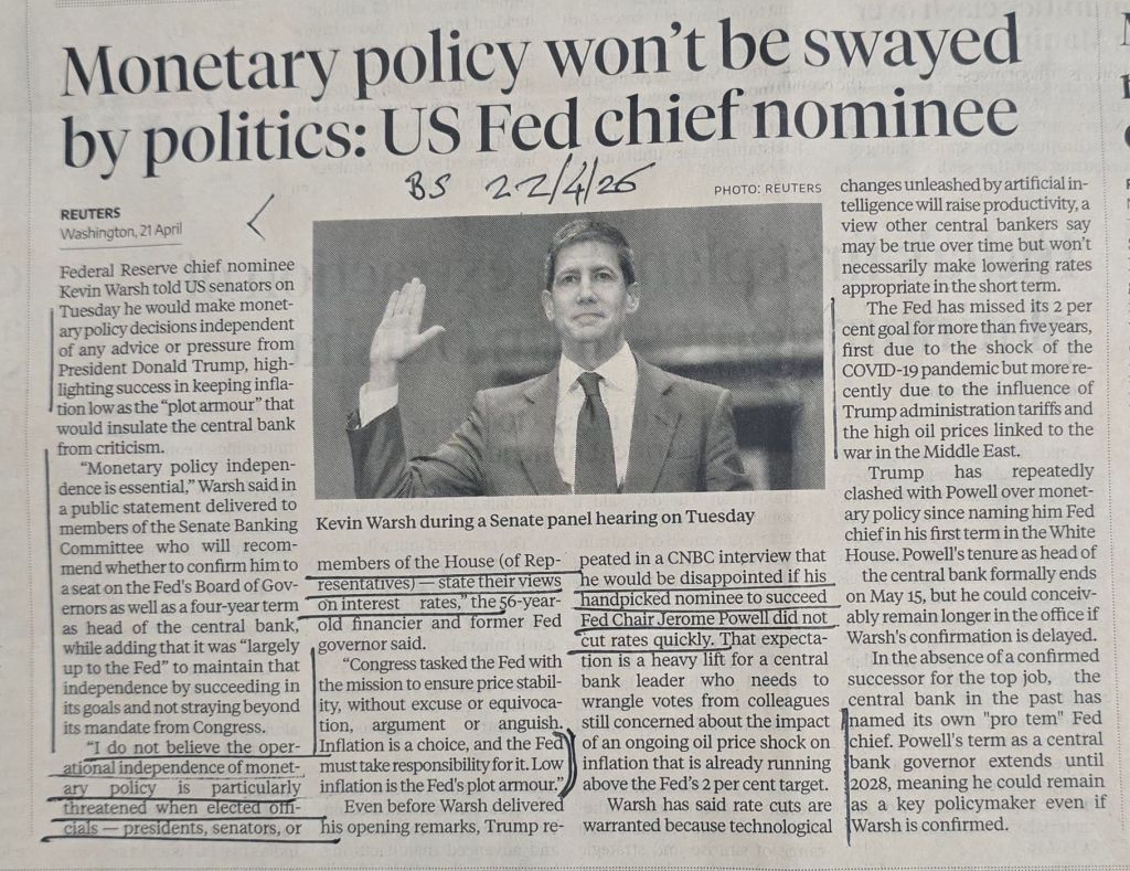 Mr Kevin Warsh–US Fed Chief Nominee–[1] I do not believe the operational independence of monetary policy is particularly threatened when elected officials–presidents-senators or members of House–state their views on interest rates [2] Inflation is a choice and the Fed must take responsibility for it–[3] Low inflation is Fed’s plot amount –Courtesy BS