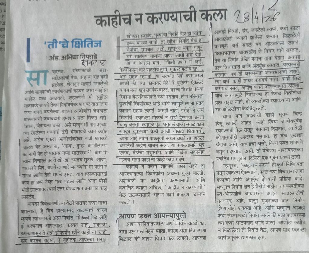 ” काहीच न करणे ” ही कृती निष्क्रियता नसून स्वतःला ऐकून घेण्याची– स्वतःच्या विचारांना जागा देण्याची आणि अंतर्मुख होण्याची प्रक्रिया आहे– [2] लेखिका पुढे म्हणतात–म्हणुनच निवांत क्षण हे चैनीचे नाहीत तर व्यक्तीच्या स्वओळखीचे आधारस्तंभ आहेत. स्वतःसाठी गुंतवणूक आहे– लेखिका अभिधा निफाडे या वकील आहेत – सौजन्य सकाळ