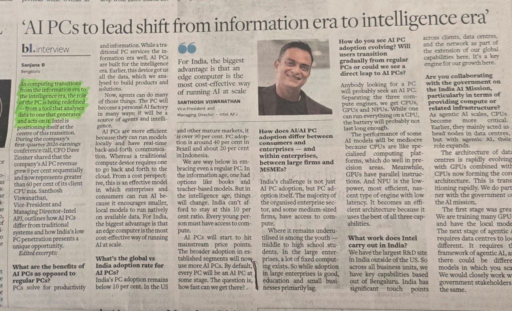 [1] Computing is transitioning from information era to intelligence era [2] Role of PC is being redefined– from a tool that analyses data to one that generates and acts on it [3] At some stage –By default every PC will be an AI PC — Courtesy BusinessLine