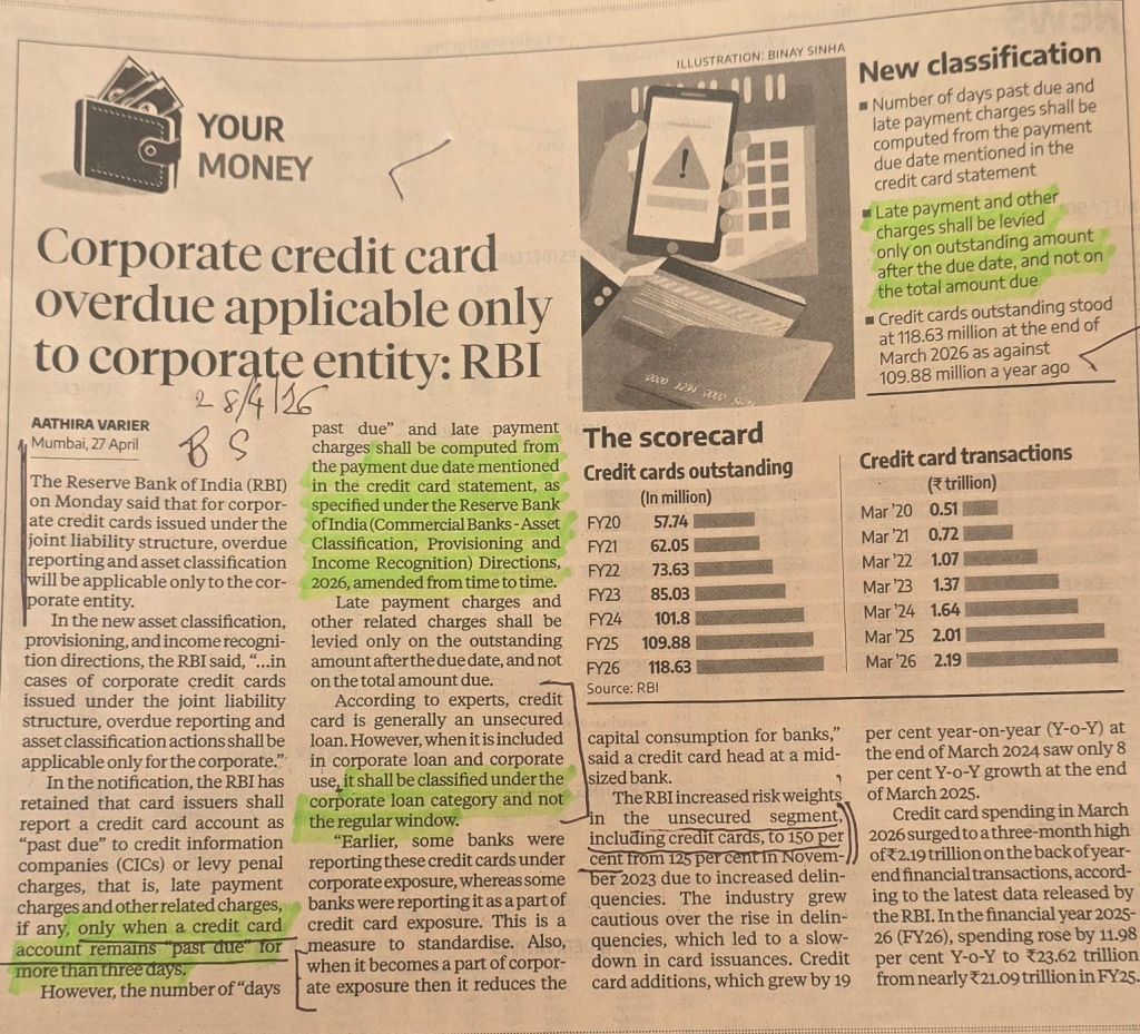 Corporate Credit cards issued under joint liability structure-RBI clarifies — [1] Overdue reporting and asset classification– will be applicable only for the corporate entity [2] Past due label only when a credit card account remains past due for more than three days [3] Such period to be computed from payment due date mentioned in the credit card statement CourtesyBS–