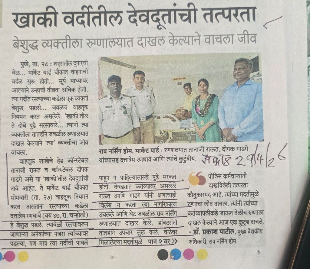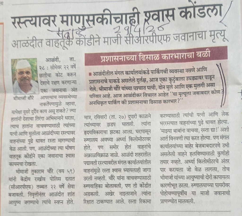 एक बातमी– पोलिसांच्या रुपात देवदूत भेटल्याची तर दुसरी बातमी ट्रॅफिक जॅम मुळे रुग्णास हॉस्पिटल मध्ये नेऊ न शकल्याने मृत्यू पावलेल्या माजी सीआरपीएफ मधील श्री चौरे यांची– संमिश्र भावनांचा हल्लकल्लोळ– कशात आनंद मानावा– कशाची खंत मानावी–हे कळण्यापलीकडे आहे– दोन्ही बातम्या सौजन्य सकाळ